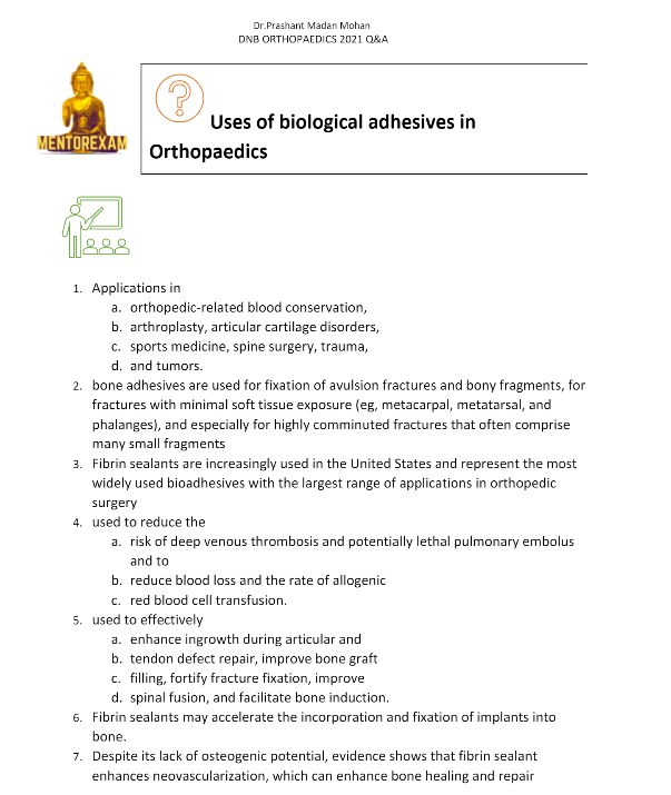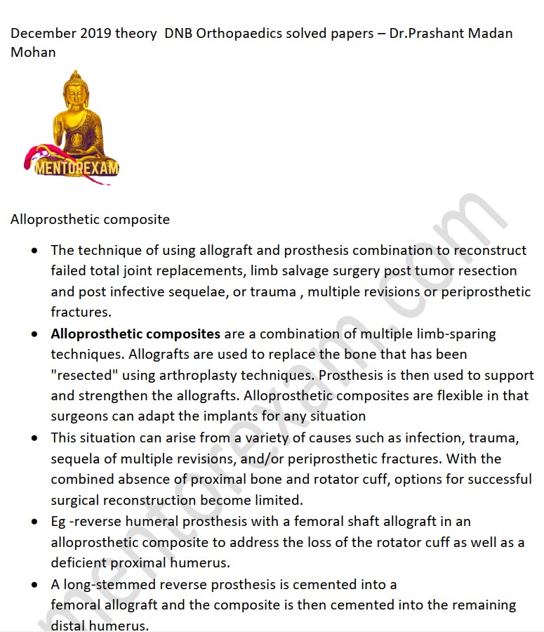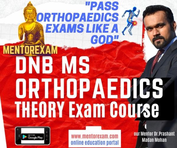Disclaimer - Wherever possible recall questions and new questions have been solved. All question papers of all years and all questions from each paper are not available, hence can only be updated in future if learners send their recalls to mentorexam.com@gmail.com. This is an initiative to improve the pass percentage of DNB orthopaedics exams by Mentorexam.Mentorexam is not affiliated to DNB or NBE or NMC.These questions are representative of real exam and are not claimed to be from the real exam, any resemblance is coincidental and Mentorexam does not take any responsibility for any harm or loss.This is purely for educational purpose.